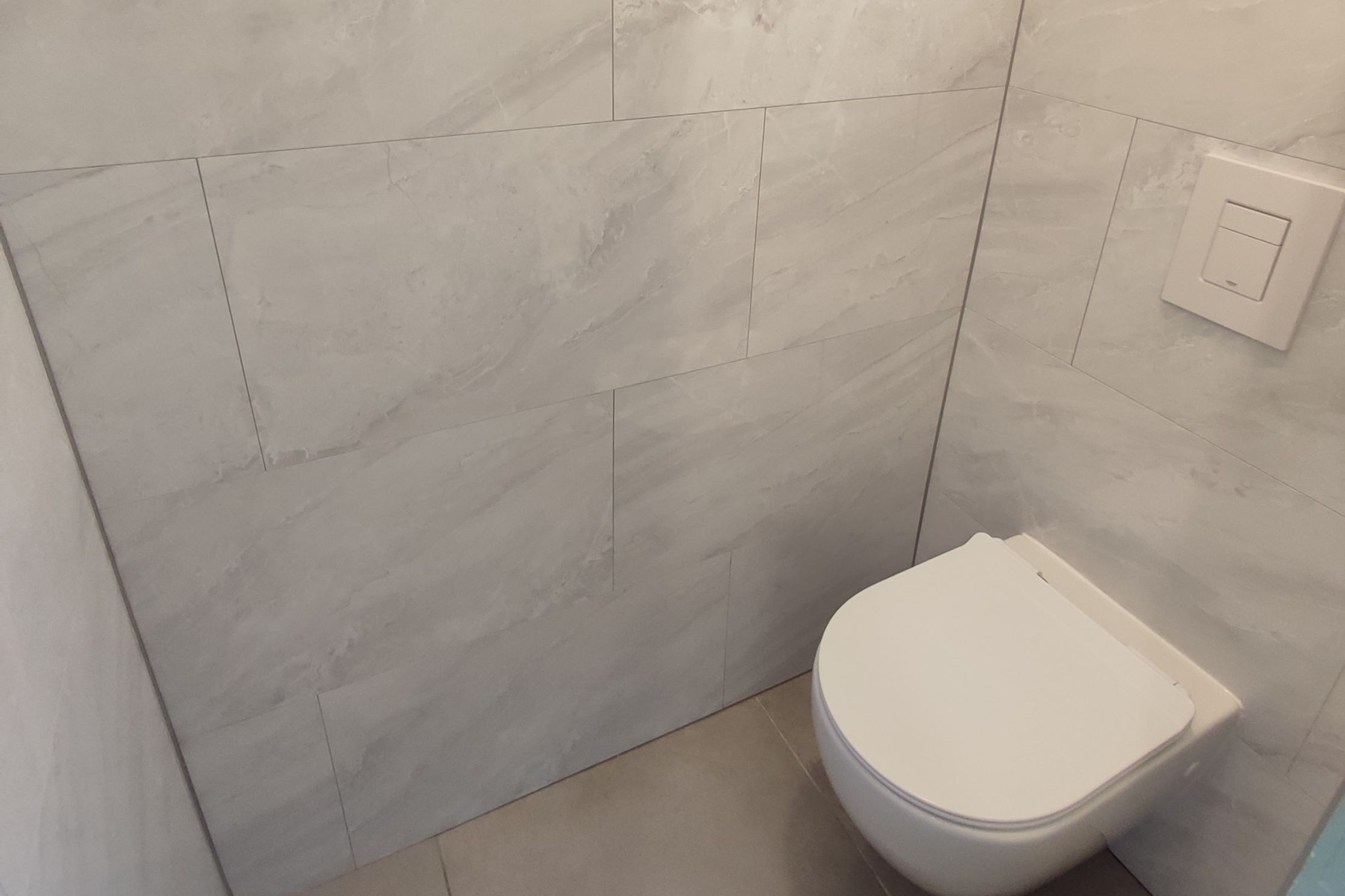 Réalisation complète d’une installation d’un WC suspendu à Angers avec finition marbre au mur.
