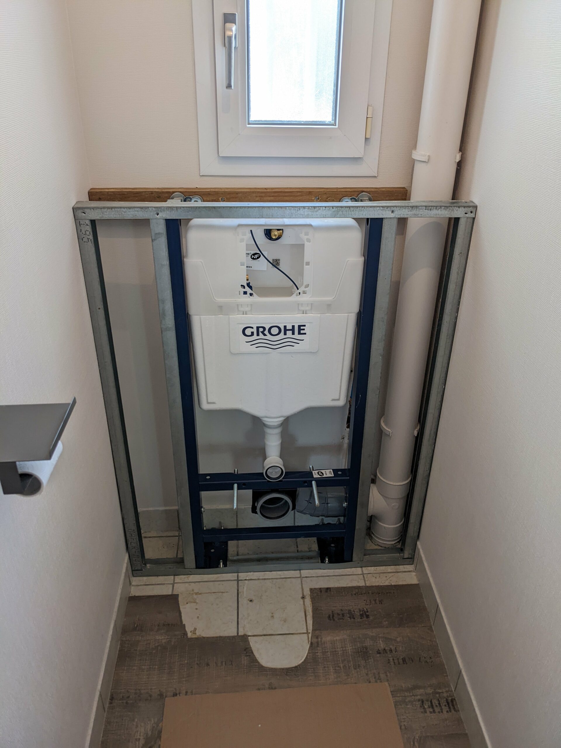 Réalisation complète d’une installation d’un WC suspendu de marque Grohe avec réalisation coffrage placoplâtre, finition peinture lessivable et imperméable et planche supérieure chêne.